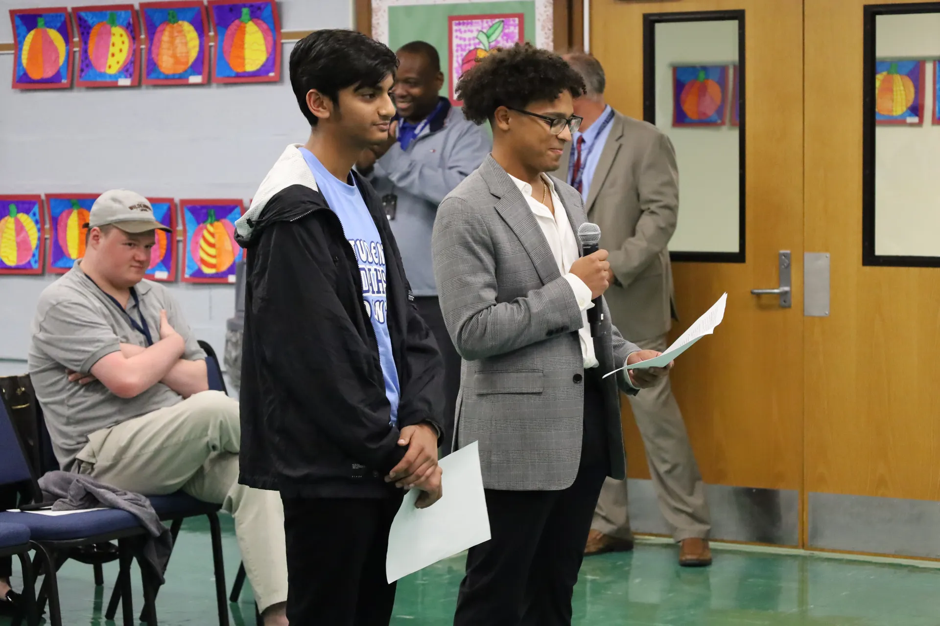 Division Avenue High School student Manav Dubey and General Douglas MacArthur high school student Anthony Ross, both presidents of their respective student governments, thanked the Levittown Board of Education on Oct. 15.
